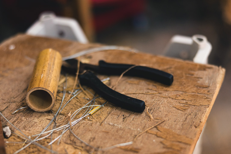 與Edmond聊了好一會兒,在約千多呎的街坊福利會忙這忙那的蕭師傅,終於走回龍頭旁邊,繼續鋪禾草。每鋪一兩寸,他便拿起鐵線繞一繞,鞏固禾草的位置。他的手勢看起來相當純熟,但原來整個紮火龍工序,由破竹、削竹、製作支架、鋪禾草、裝飾,到插香點睛,都是他無師自通的。