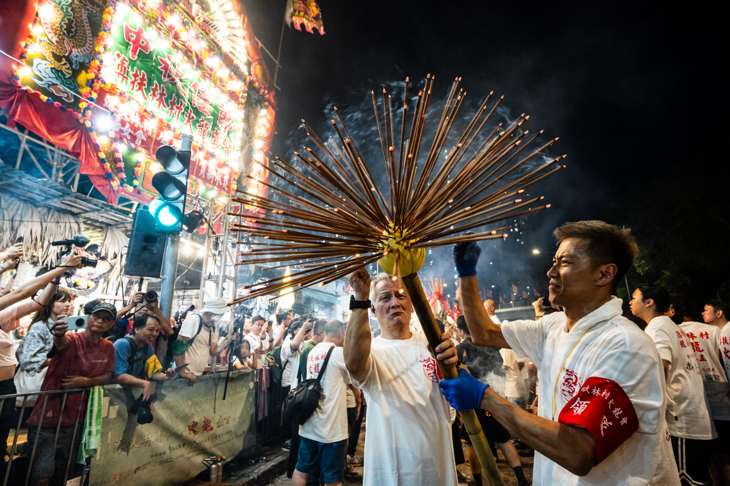 此外,每年舞火龍還需要用上六、七千支香燭。蕭師傅和團隊經過多番試驗,發現「蓮花壇香」產生的煙霧較少、氣味亦較宜人,而且比一般廟宇使用的香燭堅韌,不容易在舞龍時折裂,近年便決定使用這款香燭插於龍身。