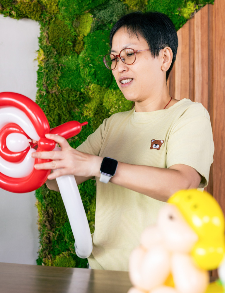 Winnie在Hactl服務超過三十年,主要負責會計和付款相關的工作,是財務部的中流砥柱。二十多年前,她因為同事邀請,第一次參加公司的義工活動,也因此與扭氣球結下不解之緣。Winnie回憶起當時的驚喜:「我看到普通的氣球,經過幾個手勢,就能變成花朵、小狗、小熊,覺得很神奇。」